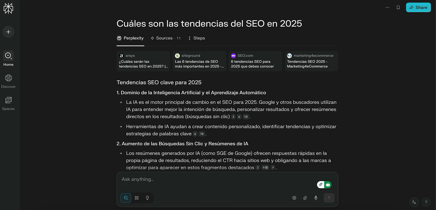 Perplexity es como un buscador con esteroides. Le haces una pregunta y no solo busca: responde con fuentes, resúmenes y contexto.